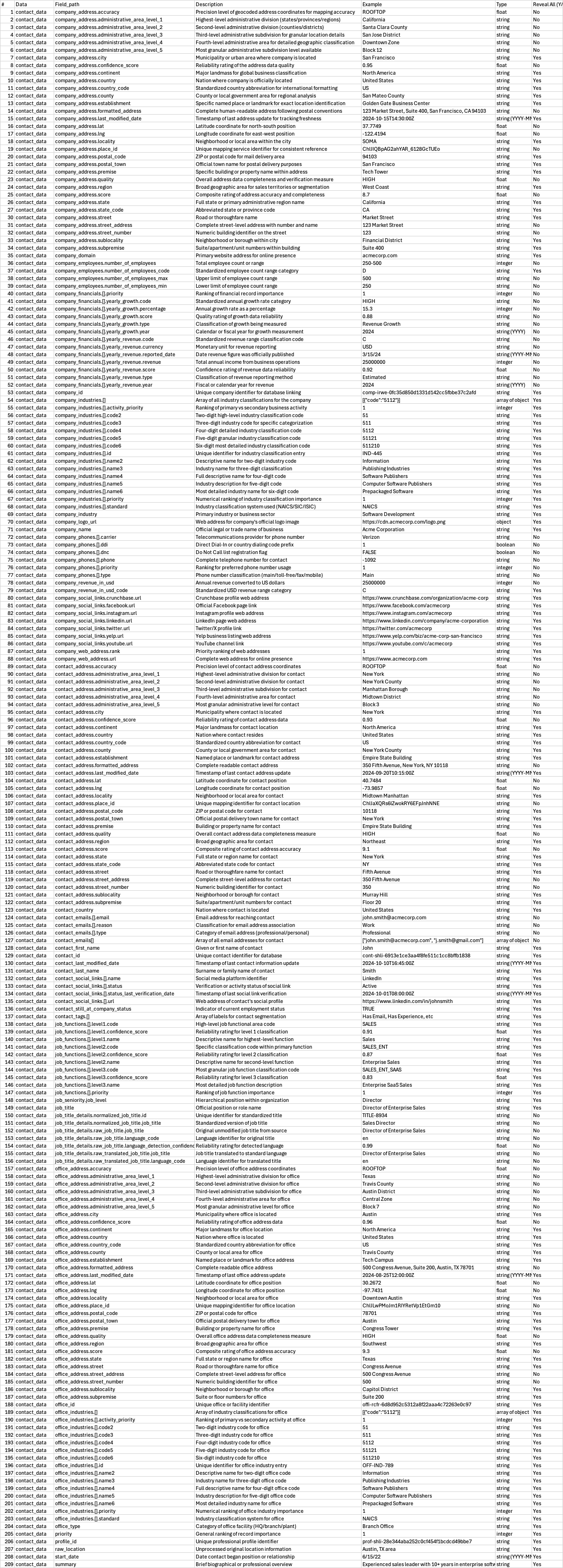 ContactDB, the stand-alone Contact Data available via our Contact API or Snowflake Share has these fields with type, description and examples.